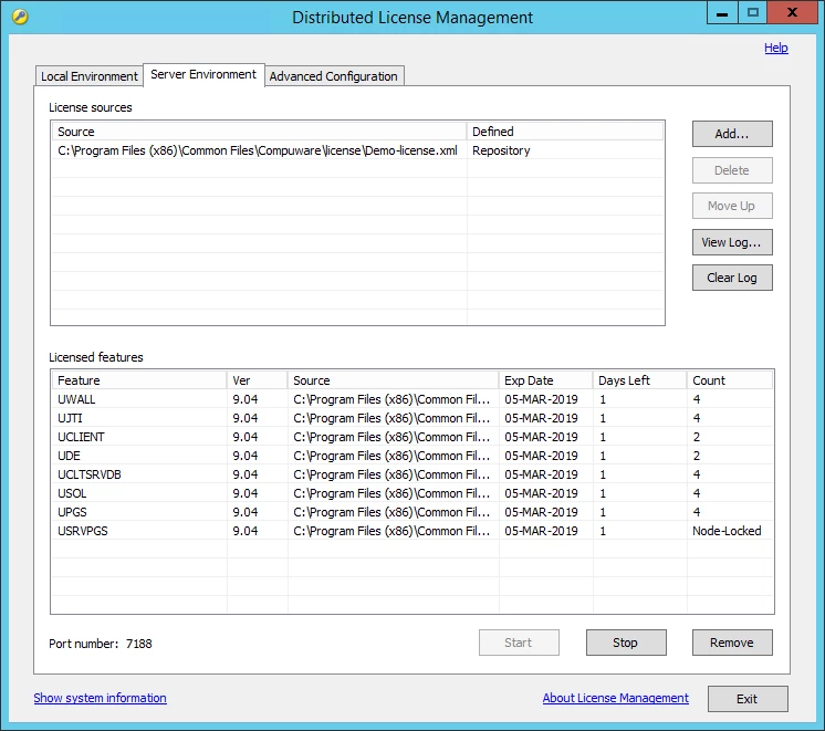 If the license file is located on this machine and it is a concurrent license, the License Service is automatically started and installed. A 'Server Environment' tab is added to the DLM application, which can be used to administer the license.